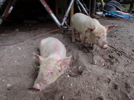 どしゃぶりの雨の中、バナナやヤシの木の陰に隠れながら雨宿りデス。